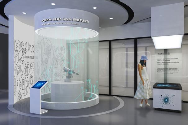 “企業(yè)數(shù)字化”、“騰飛未來”等板塊,展廳主要通過搭建多個場景還原訊飛產(chǎn)品在現(xiàn)代生產(chǎn)生活中的應(yīng)用,同時通過互動觸摸屏、物體識別桌、機械臂、VR等創(chuàng)意性展項,將訊飛企業(yè)理念、產(chǎn)品核心賣點與展項及場景相融合,智能化的展項與科技風(fēng)的空間風(fēng)格既凸顯了科大訊飛企業(yè)智能化的特點,同時也助力展示企業(yè)的核心優(yōu)勢與價值理念。
